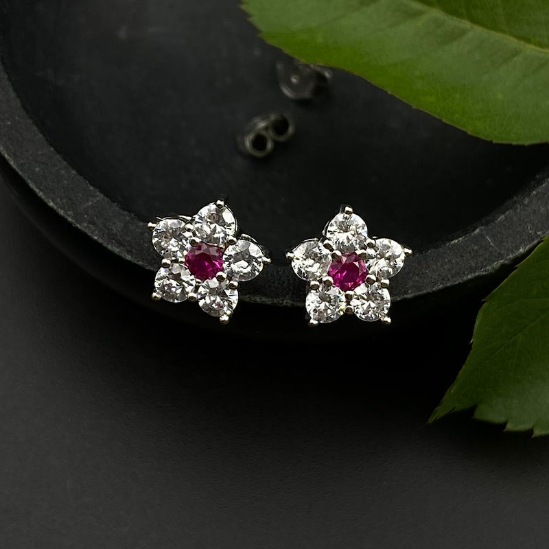 These elegant Ruby Zircon flower ear studs provide an eye-catching sparkle that will catch any onlooker's attention. These are perfect for any occasion.